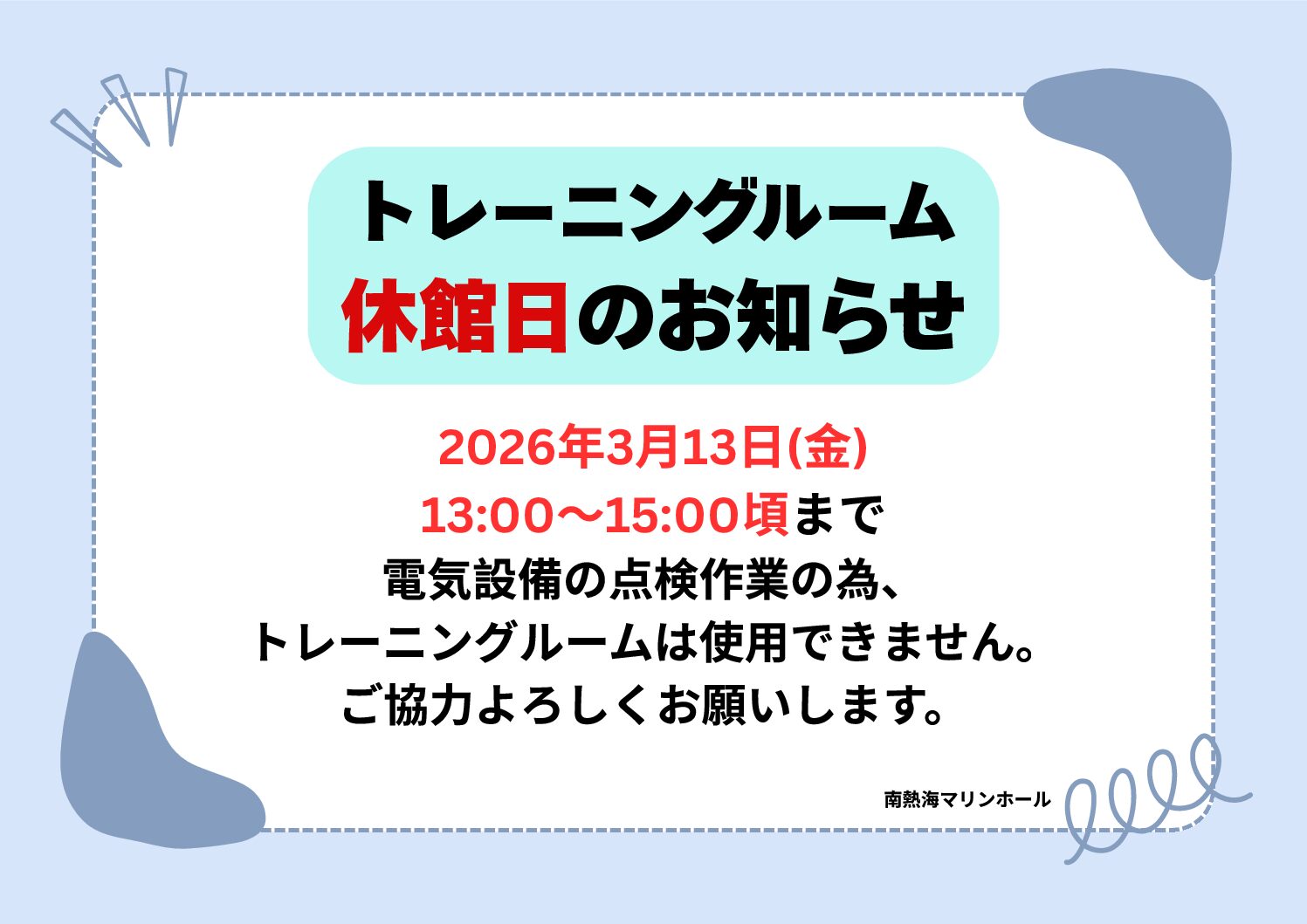 2026年2月9日 2月10日(火)ストレッチヨガ教室休講のお知らせ 2026年2月9日 2月10日(火)卓球教室休講のお知らせ 2026年2月9日 テニス月曜会練習会休講のお知らせ 2026年2月9日 ZUMBA・マットサイエンス休講のお知らせ 2026年2月8日 ボールピラティス休講のお知らせ 2026年2月8日 硬式シニアテニス(初級)休講のお知らせ 一覧を見る