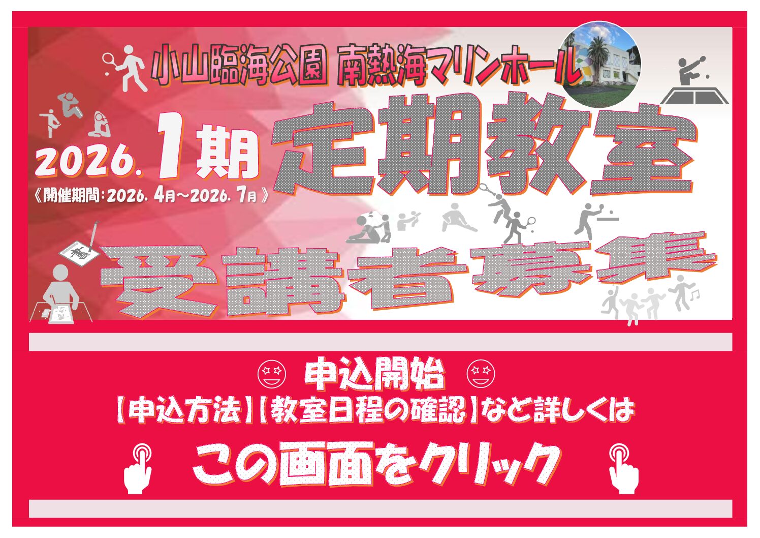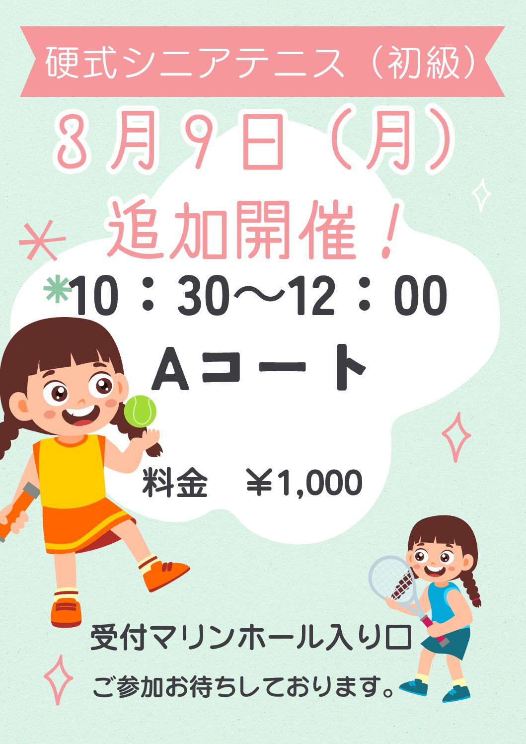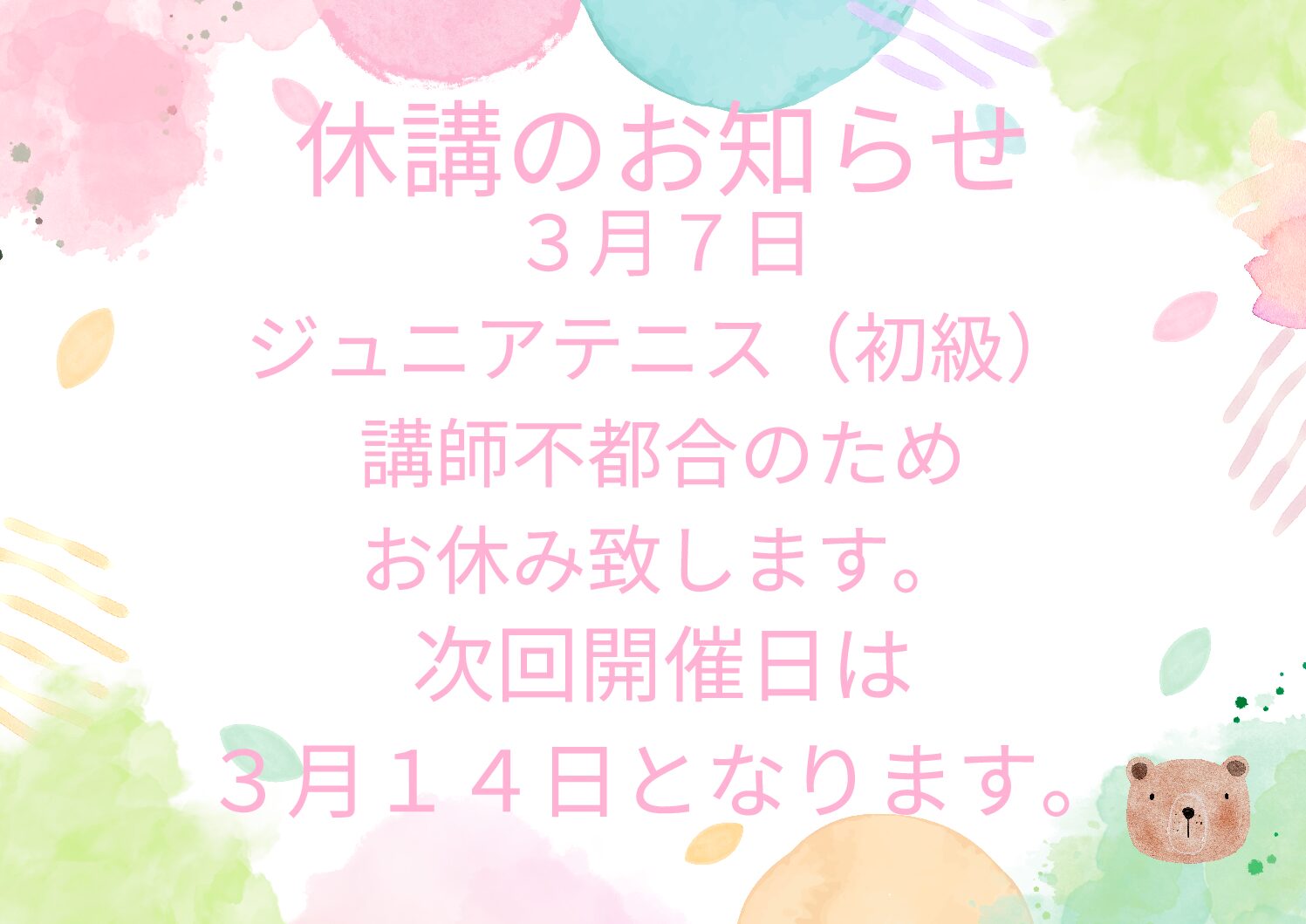 2026年3月2日 ジュニアテニス(初級)休講のお知らせ 2026年3月2日 硬式シニアテニス(初級)追加開催! 2026年3月1日 トレーニングルーム新規友達招待キャンペーン期間延長! 2026年2月25日 水曜日テニス教室開催日お知らせ 2026年2月25日 2月25日ジュニアテニス休講のお知らせ 2026年2月24日 2月25日テニス教室休講のお知らせ 一覧を見る