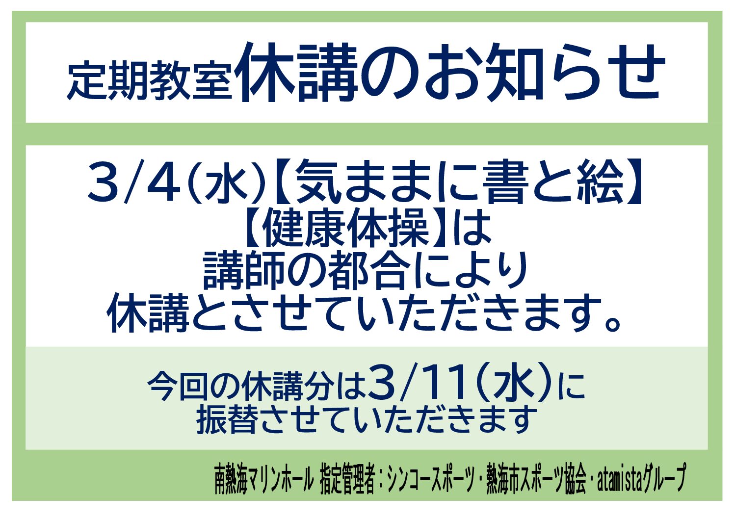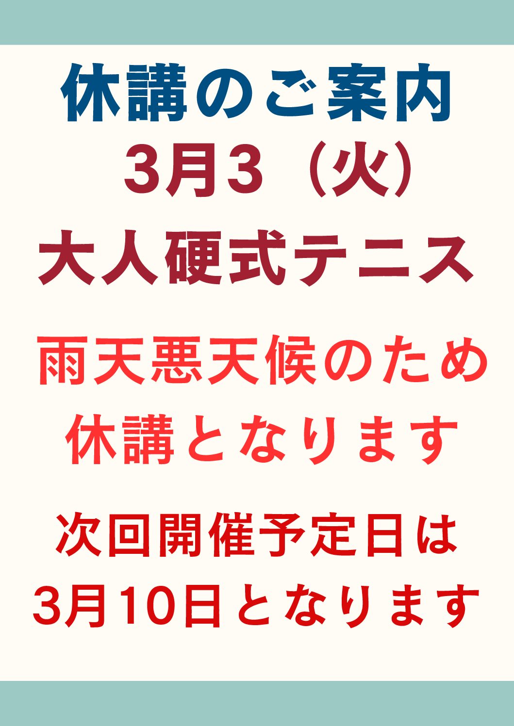 2026年3月3日 休講案内 2026年3月3日 大人硬式テニス休講のお知らせ 2026年3月2日 ジュニアテニス(初級)休講のお知らせ 2026年3月2日 硬式シニアテニス(初級)追加開催! 2026年3月1日 トレーニングルーム新規友達招待キャンペーン期間延長! 2026年2月25日 水曜日テニス教室開催日お知らせ 一覧を見る