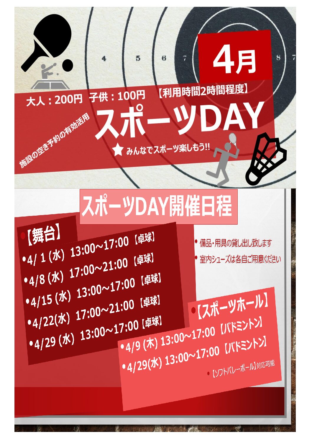 2026年3月27日 4月スポーツDAY 2026年3月27日 ジュニアテニス(初級)申込終了のお知らせ 2026年3月25日 次回ZUMBA・マットサイエンス開催日 2026年3月22日 4/25(土)ソフトバレーボール大会 2026年3月17日 ジュニアテニス(初中級)追加開催 2026年3月14日 楽しいフラダンス休講のお知らせ 一覧を見る