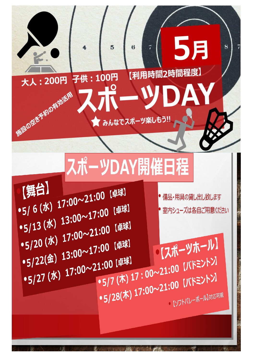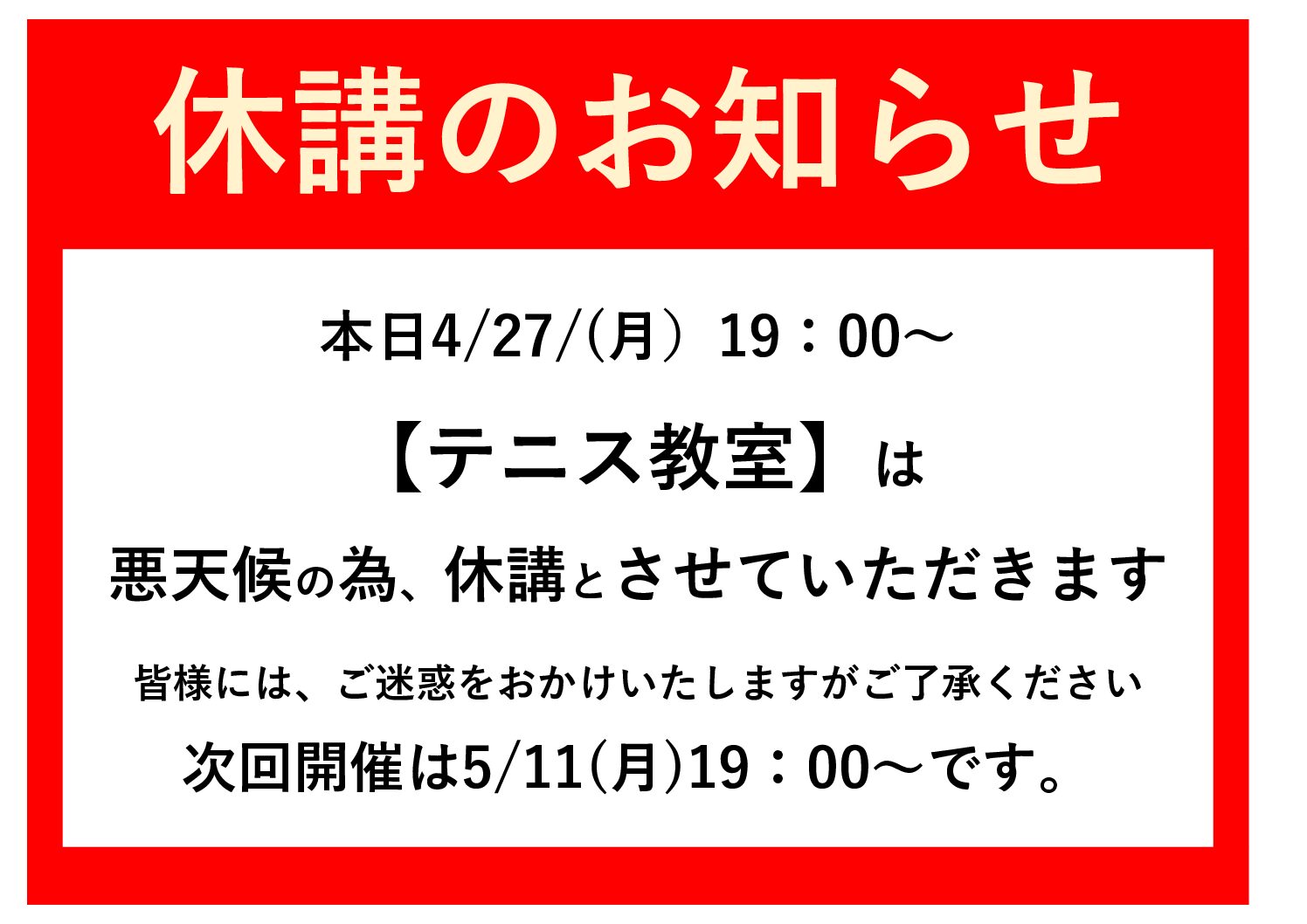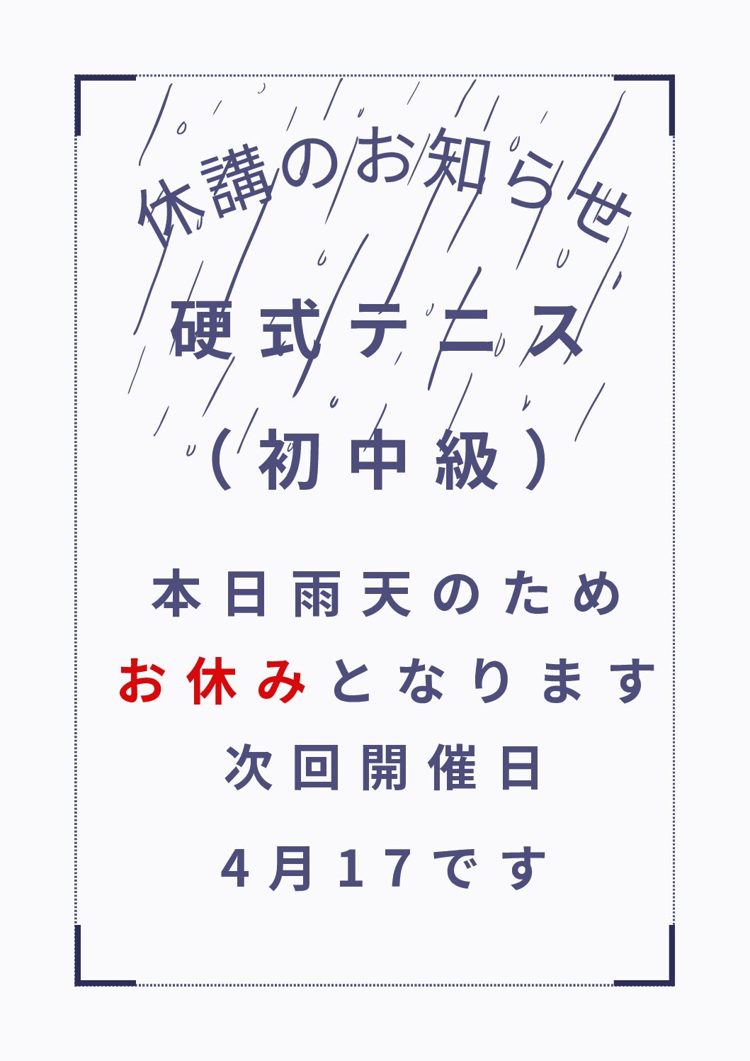 2026年4月10日 ソフトバレーボール大会お知らせ 2026年4月10日 休講のお知らせ 2026年4月5日 大人硬式テニス休講のお知らせ 2026年4月4日 2026年4月4日ジュニアテニス(初級)教室休講のお知らせ 2026年4月1日 休講のおしらせ 2026年3月27日 4月スポーツDAY 一覧を見る