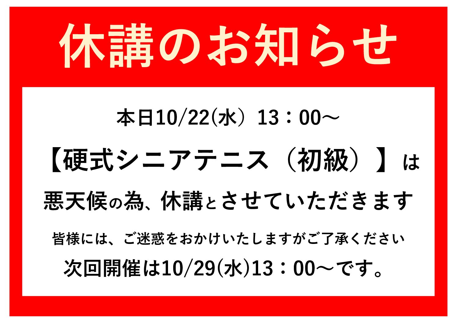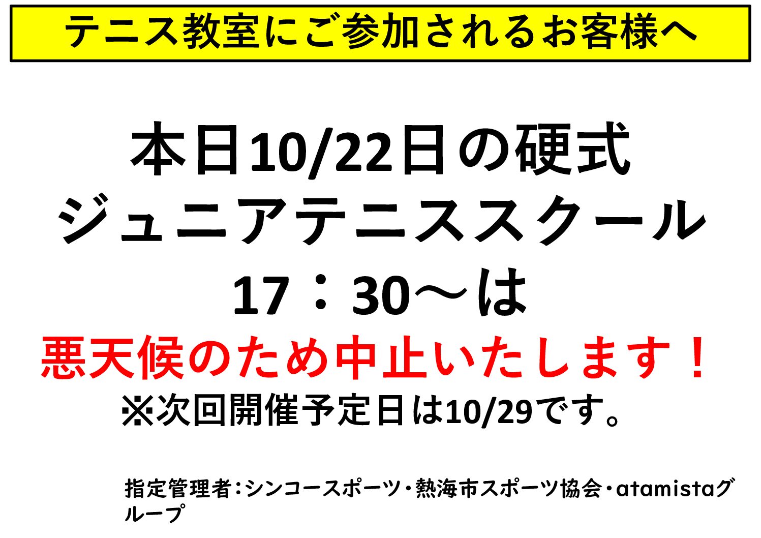 2025年10月22日 ジュニアテニススクール休講のお知らせ。 2025年10月22日 テニス休講のお知らせ 2025年10月22日 テニス休講のお知らせ 2025年10月20日 ZUMBA・マットサイエンス追加開催お知らせ いつも小山臨海公園をご利用いただきありがとうございます。 … 2025年10月20日 教室日程変更のお知らせ いつも小山臨海公園をご利用いただきありがとうございます。 … 2025年10月8日 硬式ジュニアテニススクール休講のお知らせ 2025年10月7日 公園イベント【YOKA】 南熱海マリンホール:芝生広場にて 10月25日(月) 11:00~15:0… 2025年10月6日 休館のお知らせ